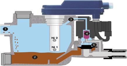 隨著容器②中冷凝液的逐漸增多,當液面升到高液位(Ni2)時,電容感測器⑥發出信號,先導電磁閥④作動,關閉先導控制氣路③,同時使隔膜閥⑤上方卸壓(與大氣相通),而隔膜閥⑤下方壓力仍為系統壓力,因此下方壓力大於上方壓力,膜閥片被冷凝液從下方頂離電磁閥閥座⑦,容器內的壓力將冷凝液由出口⑧排出。這時,FA自動卻水器的控制系統計算出液位下降到低液位(Ni1)速率,並根據這一速率精確計算隔膜閥開啟的時間,在壓縮空氣洩漏之前,關閉先導電磁閥④,系統壓力重新作用於隔膜閥上方,將隔膜閥⑤及時嚴密關閉,見圖二。